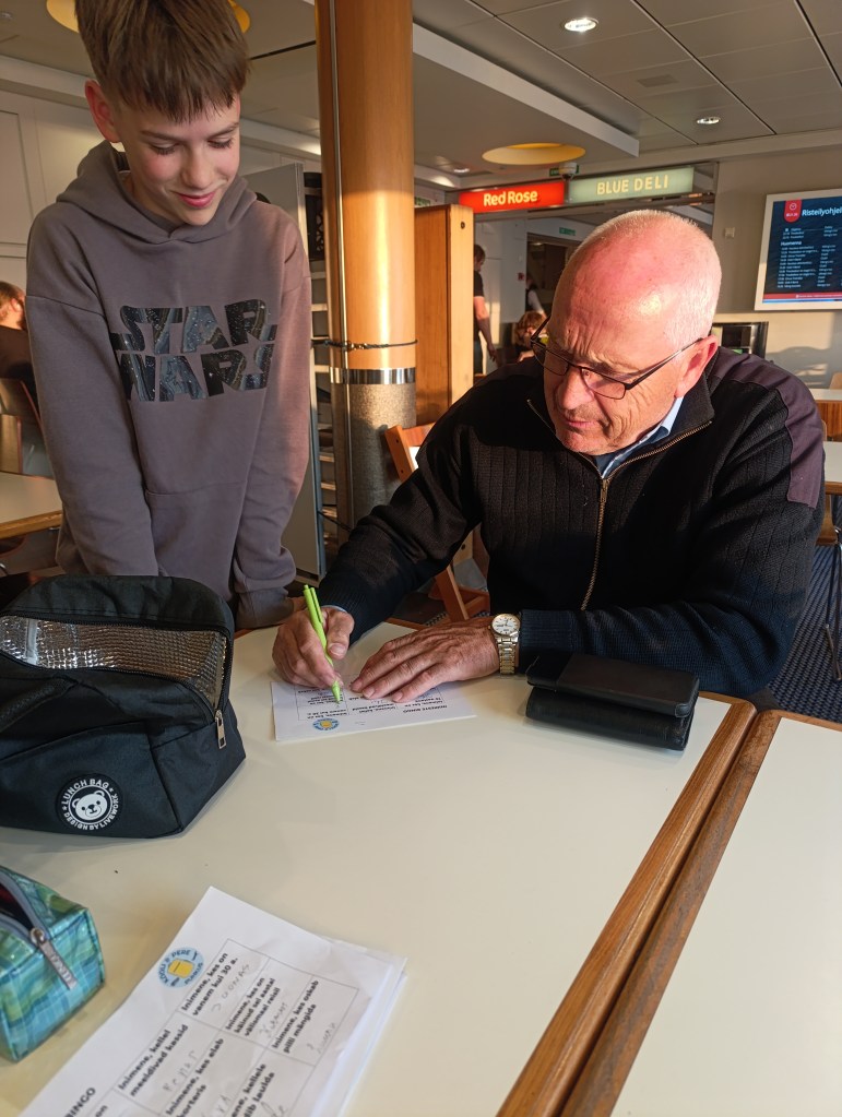 Juba ootas meid taas tore bussijuht Elmar ja asusime teele tagasi sadamasse. Laeva jõudes oli söögiisu juba hea ning igaüks ostis omale meelepärase õhtusöögi. Kõhud täis, lõõgastuti Sun Deckil ja kaardimängu taga. Enne Tallinna jõudmist sai iga soovija osaleda mängus “Inimeste Bingo”, kus tuli otsida inimesi, kes vastavad teatud kriteeriumitele (näiteks: Leia inimene kellele ei meeldi pannkoogid). Lõbus ja ühendav punkt vahvale päevale!